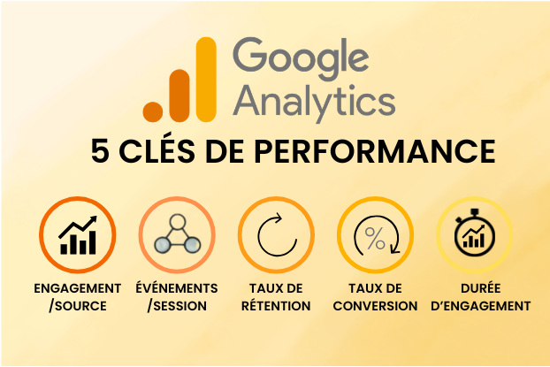 - Valeurs : 1. Utilisateurs actifs 2. Taux d’engagement 3. Nombre d’événements par utilisateur 4. Taux d’événements clés de la session 5. Durée d’engagement moyenne