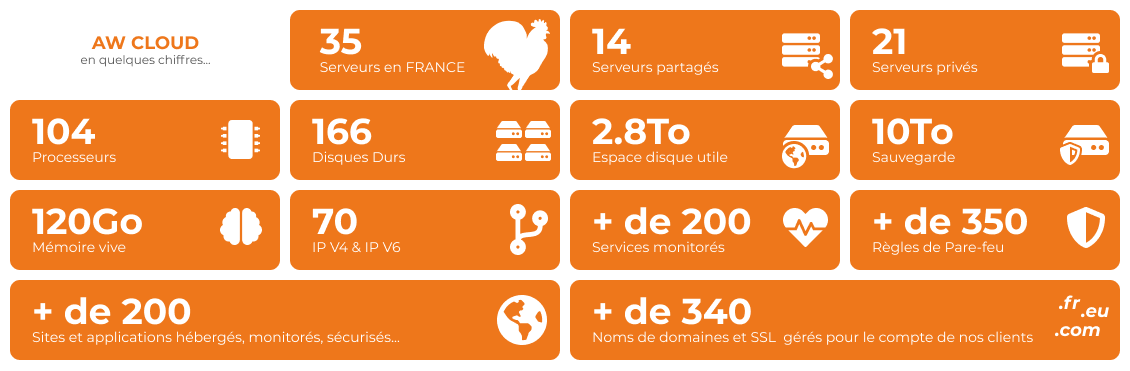 Pour répondre à vos besoins en ressources plus importantes et/ou plus spécifiques, l’équipe Anjou Web gère également des serveurs virtualisés dédiés à vos activités, en adaptant le nombre de processeurs, la quantité d’espace disque, la mémoire vive… de vos serveurs. Actuellement, l’infogérance de huit serveurs privatifs, intégrés dans la solution AW Save et les outils de monitoring, est assurée par Anjou Web.